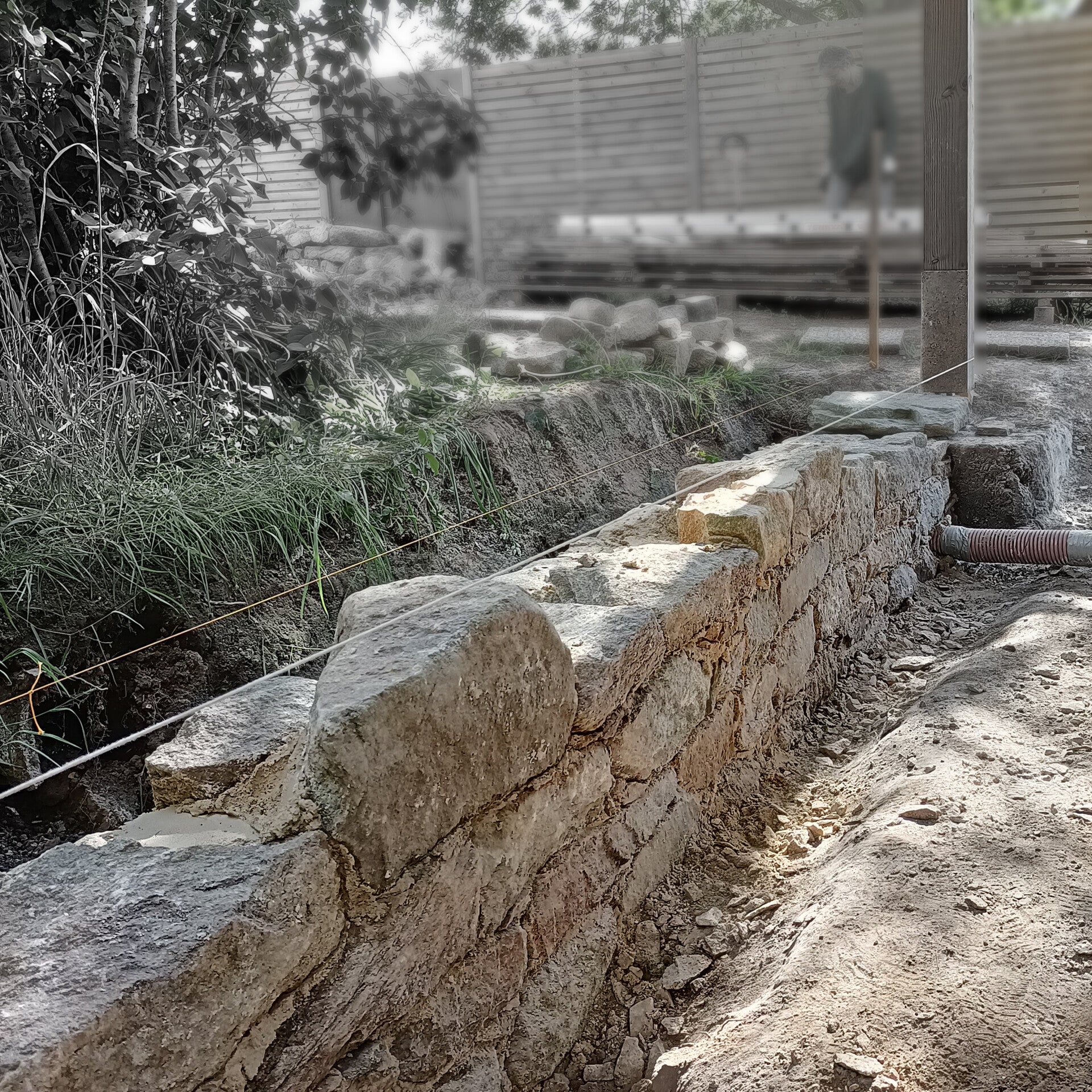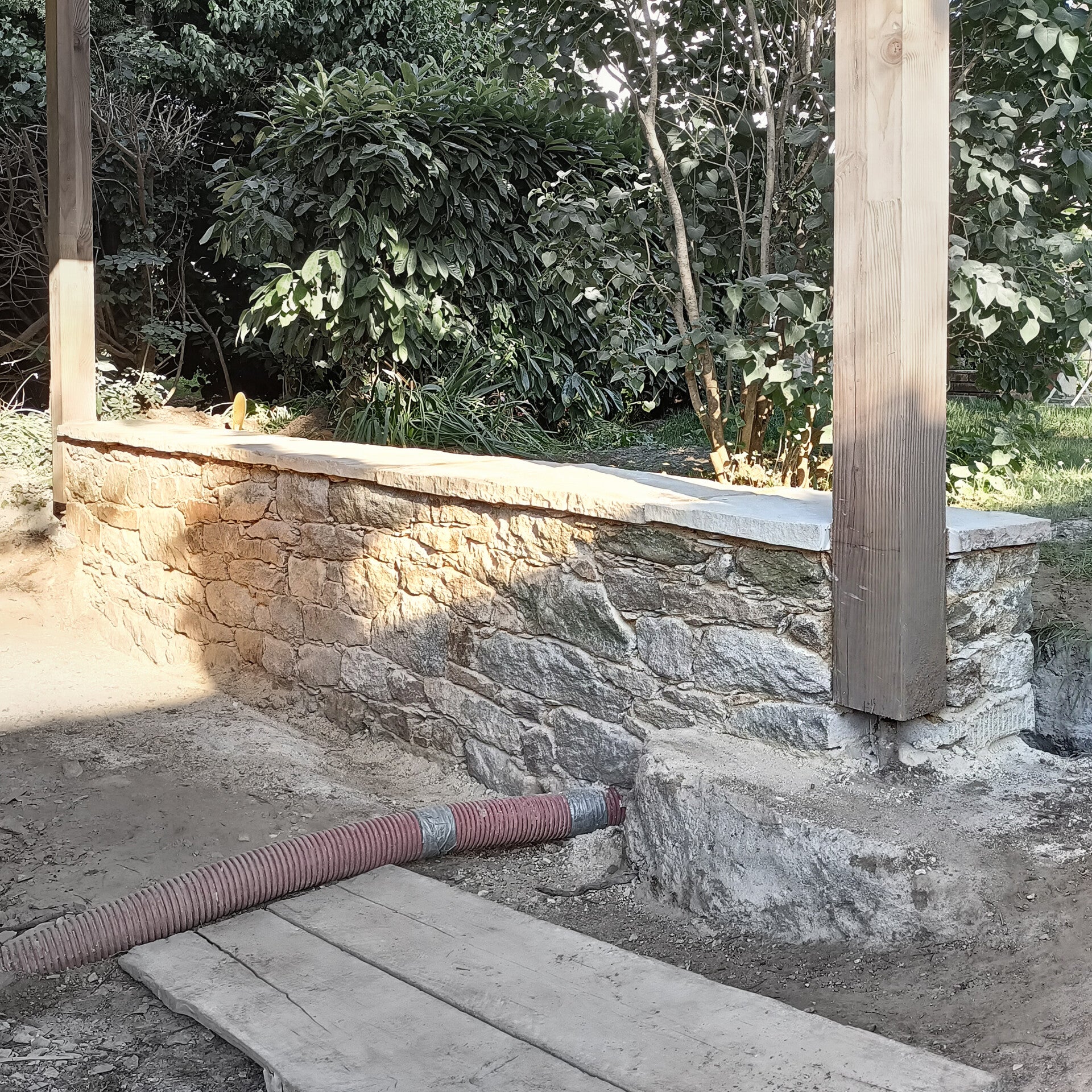Réaliser un muret, à la fois assise côté auvent et maintien du terrain côté jardin